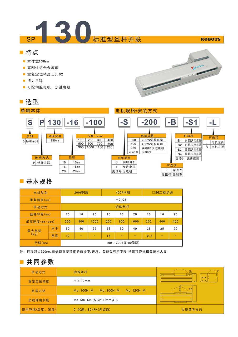 所屬型號:SP130 所屬品牌:福士工業 所屬分類:單軸模組_標準型 應用領域:紡織行業 電梯行業 機床行業